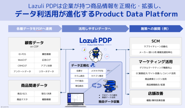 Lazuliが開発、提供する「Lazuli PDP」は、複数の外部データベースに点在していた商品情報を一括して管理し、またデータを活用しやすい形に整理、拡張するためのPDPです。メーカーや小売業者、製薬業者などが保有する多様な商品マスタデータを、AIを活用して名寄せし、効能や製品の特徴からメタタグの付与や関連付けを行います。これらの情報が「NINJA DB」に格納され、「Lazuli PDP」として、ユーザーに提供されます。