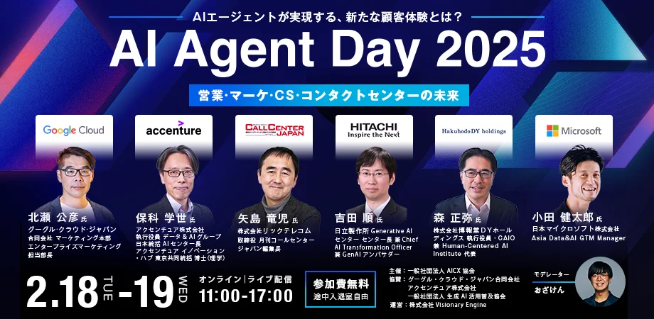 「AI Agent Day 2025」は、2月18日、19日に2日間にわたり実施されるオンラインカンファレンスです。AIエージェントに関連する分野のプロフェッショナル25名が一堂に会し、「顧客体験の変革」をテーマに、顧客体験から従業員体験、さらには生活や働き方の変化まで、AIエージェントの活用事例や導入における課題、解決策に関する講演や議論を行います。「AI Agent Day 2025」への参加者は、コールセンターやマーケティングの実務に近いテーマから制度改革に至るまでの多様なセッションを通じて、AIエージェントのトレンドや可能性を理解することができます。