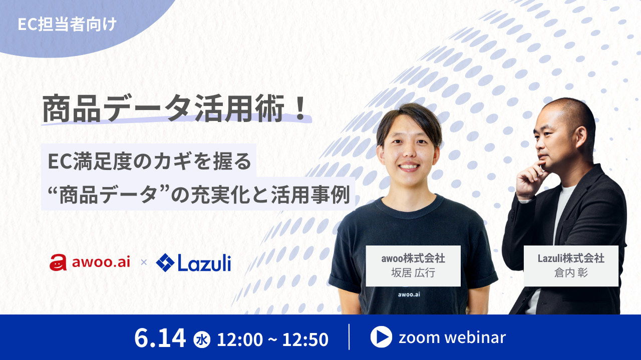 AI 技術を活用した、クラウド製品マスタ「Lazuli PDP」の開発・提供を行うLazuli株式会社(本社:東京都千代田区、代表取締役:萩原 静厳)は、2023年6月14日(水)に開催される「商品データ活用術!EC満足度のカギを握る“商品データ”の充実化と活用事例(主催:awoo株式会社、Lazuli株式会社)」に登壇します。