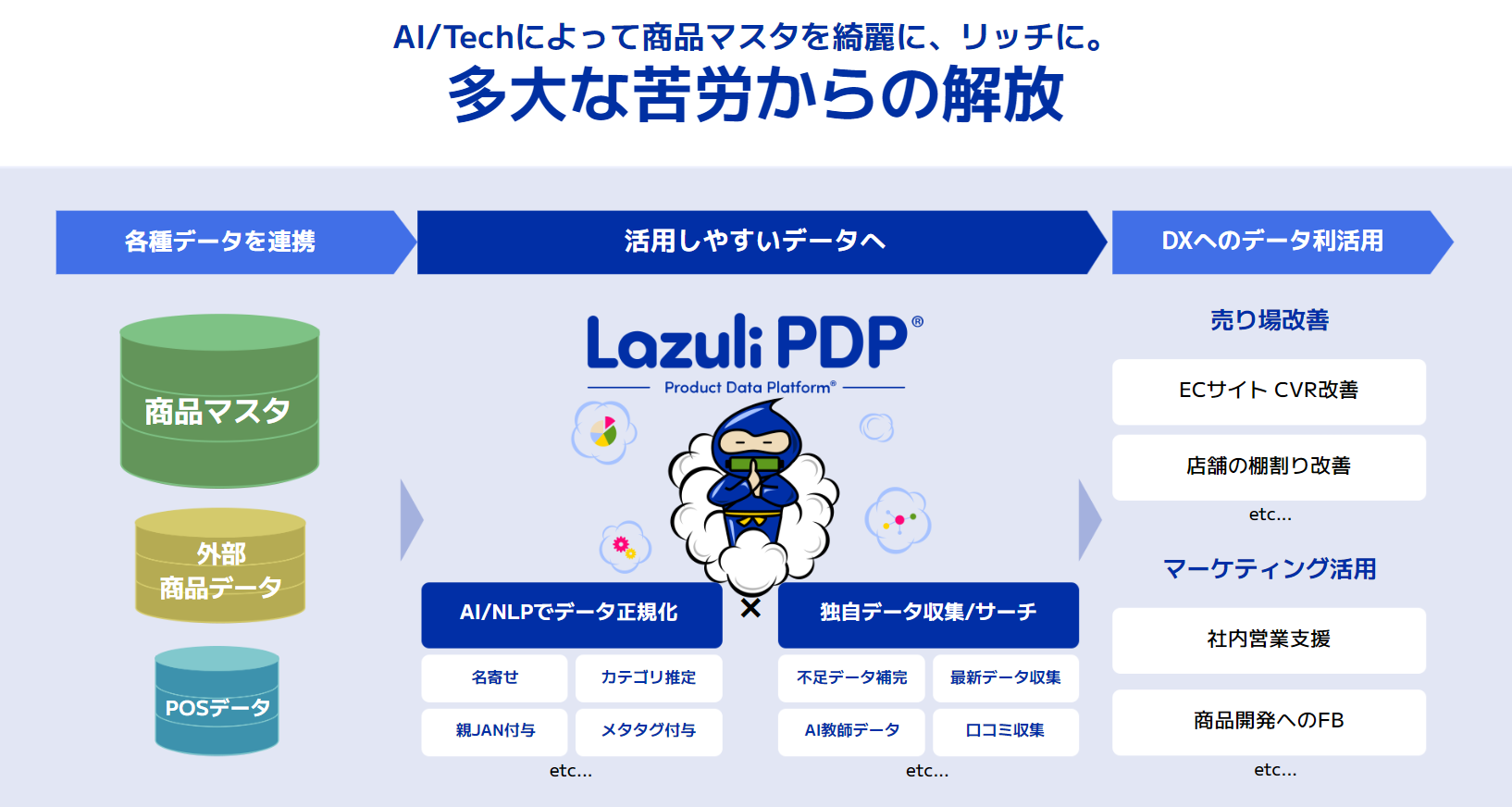Lazuliが開発、提供する「Lazuli PDP」は、複数の外部データベースに点在していた商品情報を一括して管理し、またデータを活用しやすい形に整理、拡張するためのPDPです。メーカーや小売業者、製薬業者などが保有する多様な商品マスタデータを、AIを活用して名寄せし、効能や製品の特徴からメタタグの付与や関連付けを行います。これらの情報が「NINJA DB」に格納され、「Lazuli PDP」として、ユーザーに提供されます。
