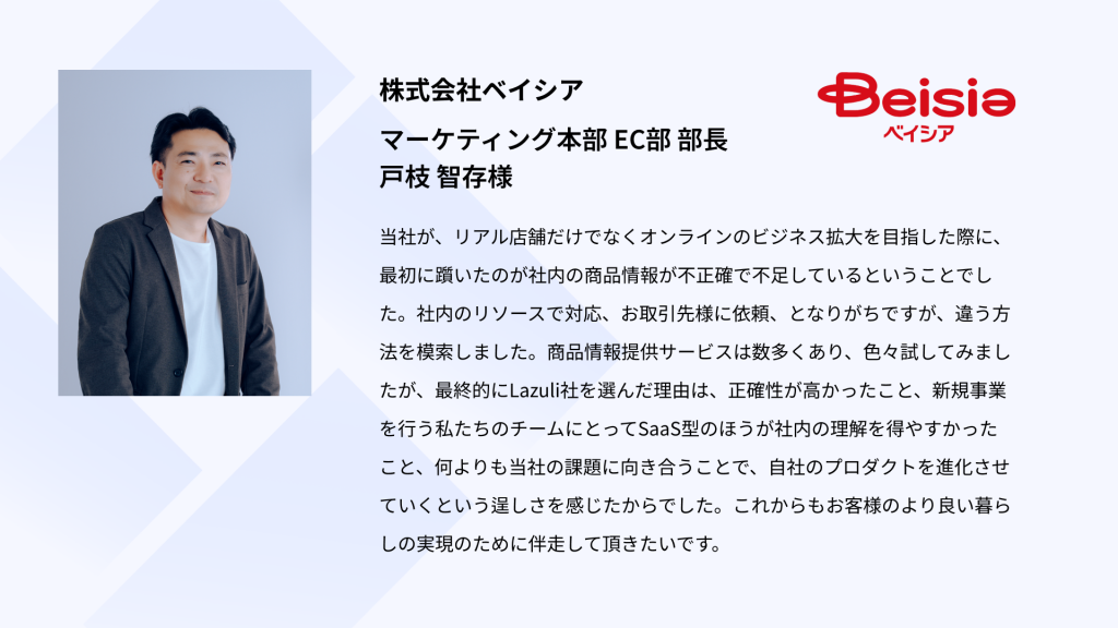 Lazuliは、2020年の創業以来、AIによる自然言語処理と大規模データを扱う技術を活用した「Lazuli PDP」を核としたソリューションで、食品・飲料・日用品、電化製品をはじめとする多様な領域における課題を解決し、企業のDX推進を支援してきました。独自のプロダクトデータ基盤を活用し、データ統合・分析を通じて、商品情報を軸とした顧客体験の価値向上とデジタル施策の推進を実現しています。すでに、アサヒビールやロッテ、ベイシア、ヤマダデンキなど、それぞれの業界の中でもデジタルの力を最大限活用している主要企業に採用され、データ収集・整備の効率化や顧客データを活用したデジタル施策で新たな価値を創出しています。