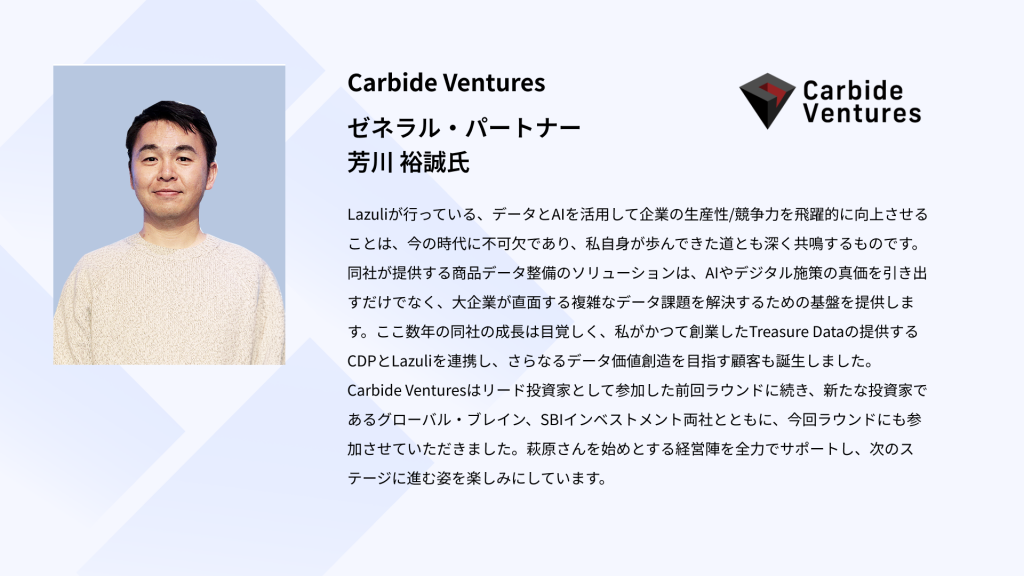 AI技術を活用し商品データ整備を行う「Lazuli PDP(Product Data Platform)」の開発及びソリューション提供を行うLazuli株式会社(本社:東京都港区、代表取締役:萩原 静厳、以下Lazuli)は、2024年12月、グローバル・ブレイン株式会社をリードインベスターとして、SBIインベストメント株式会社、Carbide Ventures、を引受先とするシリーズBラウンドの第三者割当増資に関する契約を締結しました。本ラウンドの調達額は総額10億円で、これにより、Lazuliの累計調達額は、15億6000万円になります。