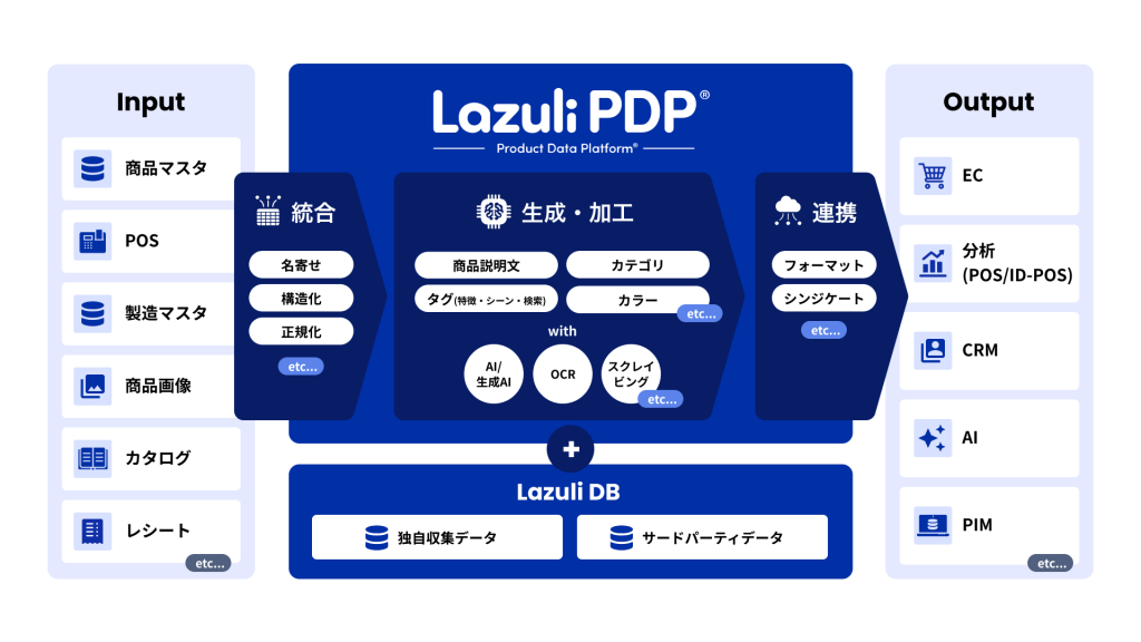 Lazuliが開発、提供する「Lazuli PDP」は、複数の外部データベースに点在していた商品情報を一括して管理し、データを活用しやすい形に整備、連携するためのプラットフォームです。製造業者や小売業者などが保有する多様な商品マスタデータを、AIを活用して名寄せし、製品の特徴や利用シーンからメタタグの付与や関連付けを行います。これらの情報が「Lazuli PDP」を通じて、各種ツールに自動連携されます。