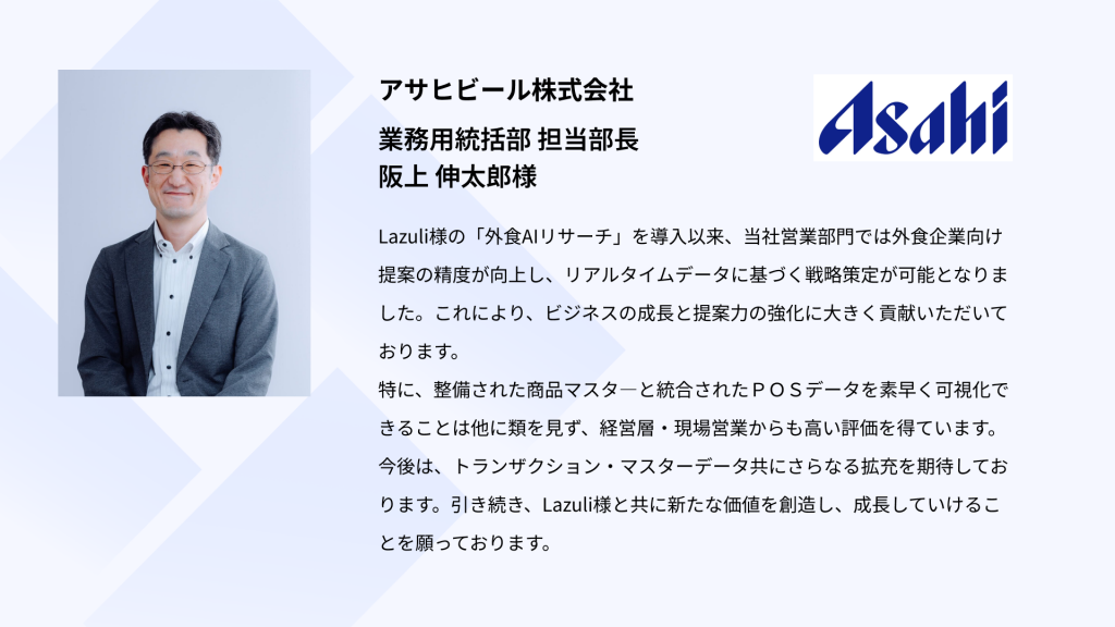 | 事業内容 | プロダクトデータプラットフォーム「Lazuli PDP」の開発・提供 外食のトレンドに関するリサーチ/データ提供サービス「外食AIリサーチ」の提供 |