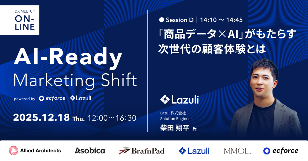 プロダクトデータプラットフォーム「Lazuli PDP」を提供するLazuli株式会社(本社:東京都渋谷区、代表取締役:萩原 静厳)は、2025年12月18日(木)に株式会社SUPER STUDIOと共同主催するオンラインカンファレンス「AI-Ready Marketing Shift — データ基盤から始まる、AI実装と顧客体験の進化」に登壇します。