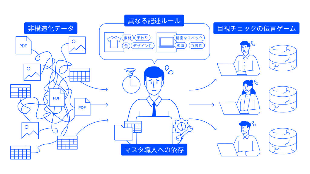 メーカーから届くカタログPDFやExcel、画像といった「非構造化データ」は、そのままではシステムで処理できません。これらを人手で整備しようとすれば、ビジネスの拡大スピードに管理業務が追いつかなくなるのは自明です。