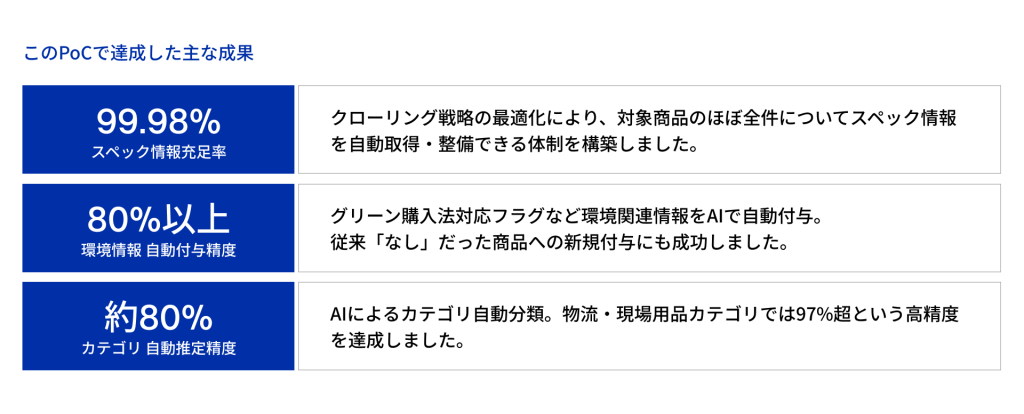グリーン購入法対応フラグなどの環境情報について、80%以上の精度で自動付与できることが実証されました。また、従来「なし」として登録されていた商品の中に、実際には環境対応商品であったものが多数含まれていることも判明し、マスタデータ全体の品質向上にも貢献しました。