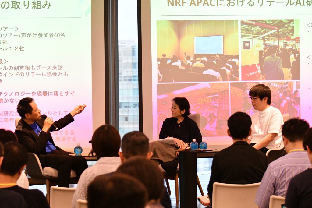 株式会社IBAカンパニー代表取締役の射場瞬氏、一般社団法人リテールAI研究会理事の林拓人氏、Lazuli株式会社執行役員の北庄司英雄の3名でAPAC圏の最新リテールトレンドについてディスカッションされました。NRF APACはアジア初開催で、全体で7,000人が参加登録し、そのうち約400人が日本人でした。Lazuli株式会社としても初の海外出展となり、Facebookグループで日本人コミュニティを立ち上げ、現地では学びのインプットとアウトプットの場を提供するなど、参加者からご好評をいただきました。